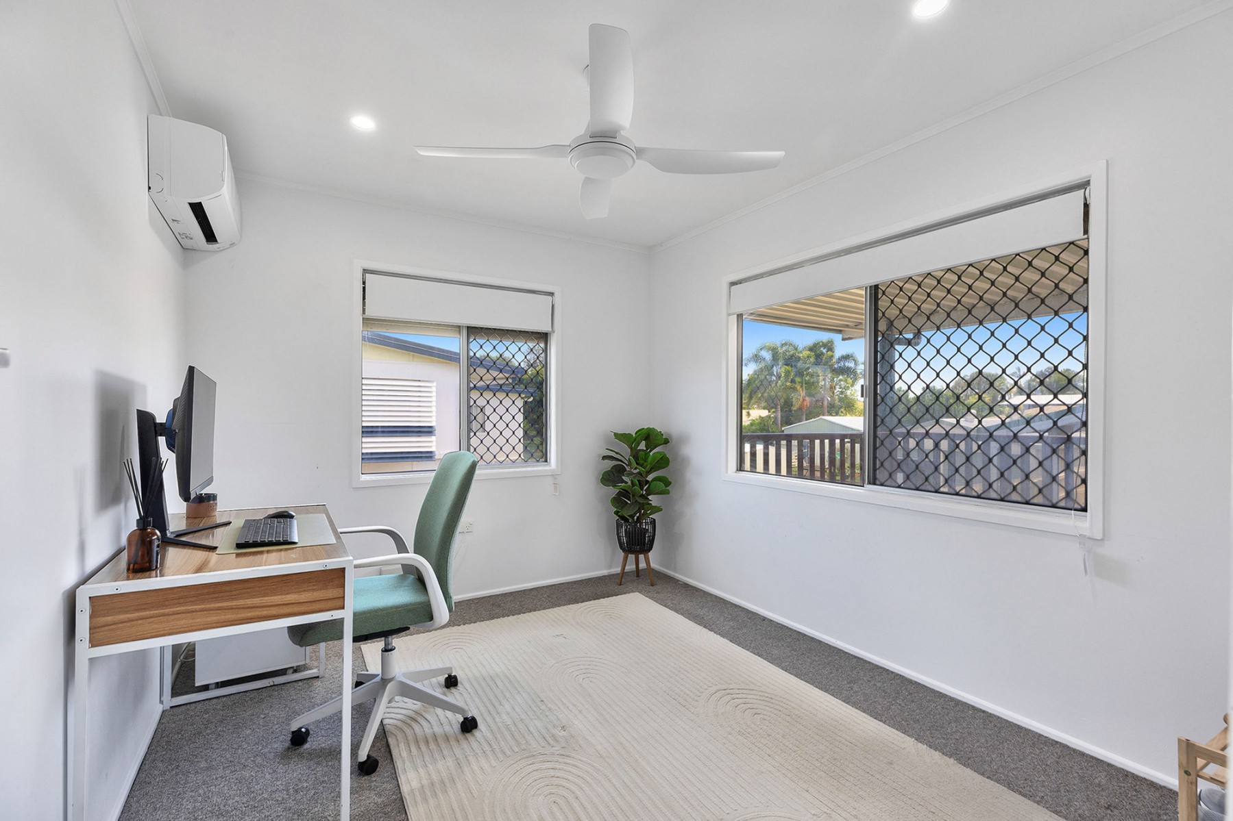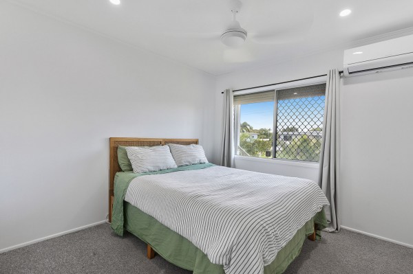 - Three-bedroom layout, including one with built-in wardrobe, all with fans and air conditioning
