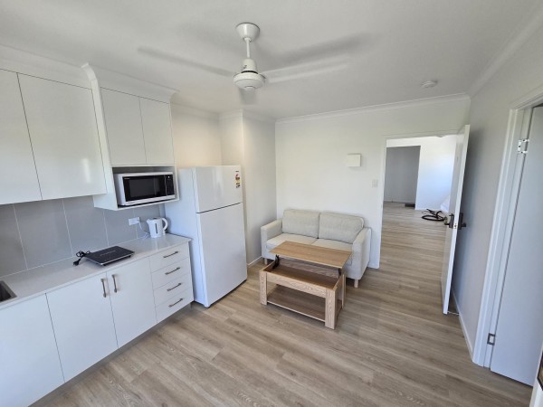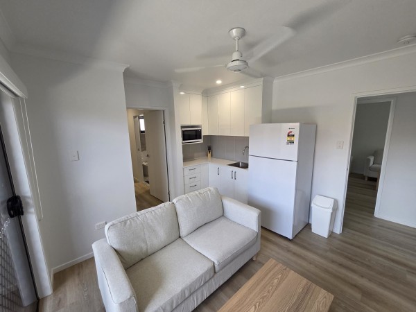 - Separate kitchen and living area within the studio