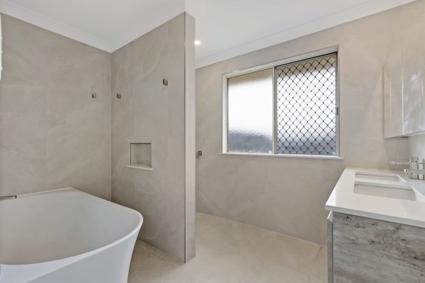 - A beautifully renovated main bathroom featuring floor-to-ceiling tiles and a sleek, contemporary design